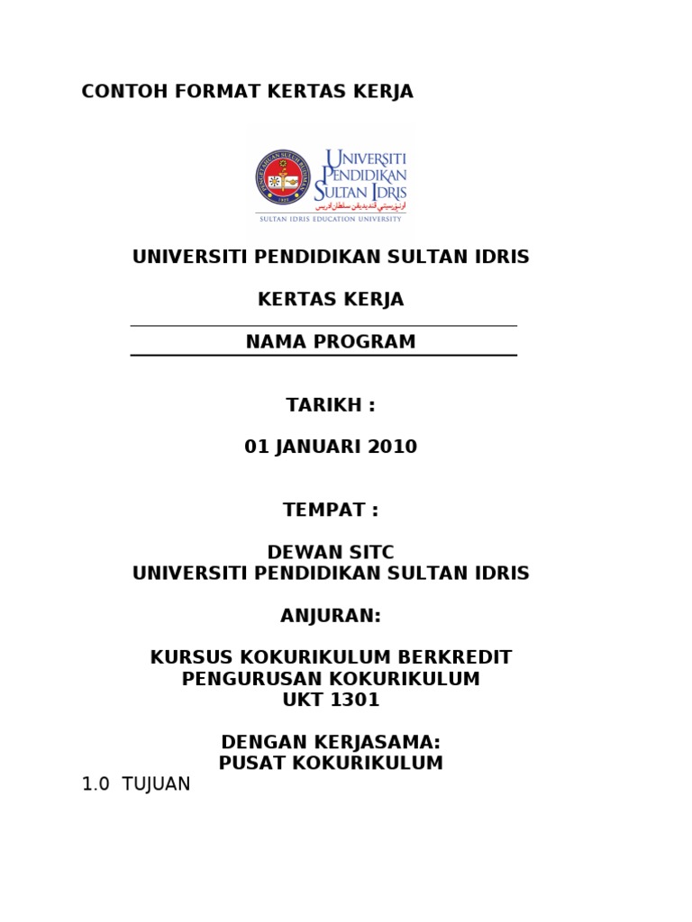 CONTOH FORMAT KERTAS KERJA UNIVERSITI PENDIDIKAN SULTAN IDRIS KERTAS KERJA NAMA PROGRAM TARIKH. Program program 2 kertas kerja. Contoh format kertas kerja kertas kerja nama program tajuk program kod kulliyyah kumpulan kluster.